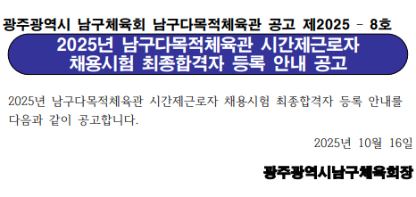 [공고 2025-8호] 남구다목적체육관 운영팀 시간제근로자 최종합격자 등록안내